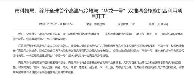 中国核电的快速发展,还体现在技术应用的拓展上。2026年1月开工的江苏徐圩“核能供热+发电”双堆耦合项目,就是中国核电的全新探索,打破了核电只能用于发电的局限,将核电技术拓展到工业供热领域,开启了核电多元化应用的新篇章。
