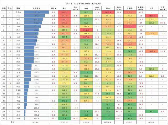 再看大家熟悉的广东和江苏,2025年广东发电量大概7094亿度,江苏发电量6437亿度左右,和内蒙古的8517亿度比起来,差距非常明显,内蒙古比广东多发了1400多亿度电,比江苏多发了2000多亿度电,这样的差距不是一点点,而是实打实的领先。